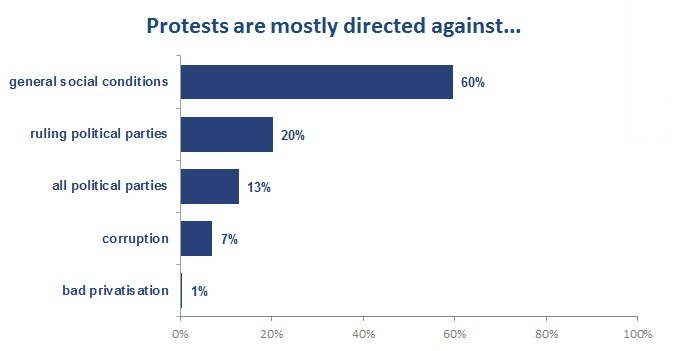 Most of those who do not give full support to protests, are explaining it with their disagreement with violence. Citizens see these protests mostly (60%) as insurgence against general social conditions. Smaller share of respondents see protests as against political parties in power (20%) and against all political parties (13%). Protests were least qualified as against corruption and bad privatization.