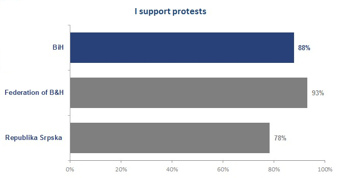 Protests are the result of widespread dissatisfaction of citizens. Strong support of protests has united the society as they are largely supported in both political entities, in Federation of B&H and in Republic of Srpska as well. If protests continue to be violent, support will decline, most probably below 50%. Protests, in general, represent insurgence against general social conditions. However, only half of respondents feel that these protests would cause any major change.